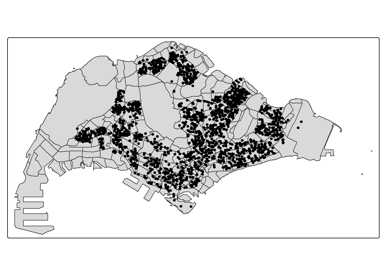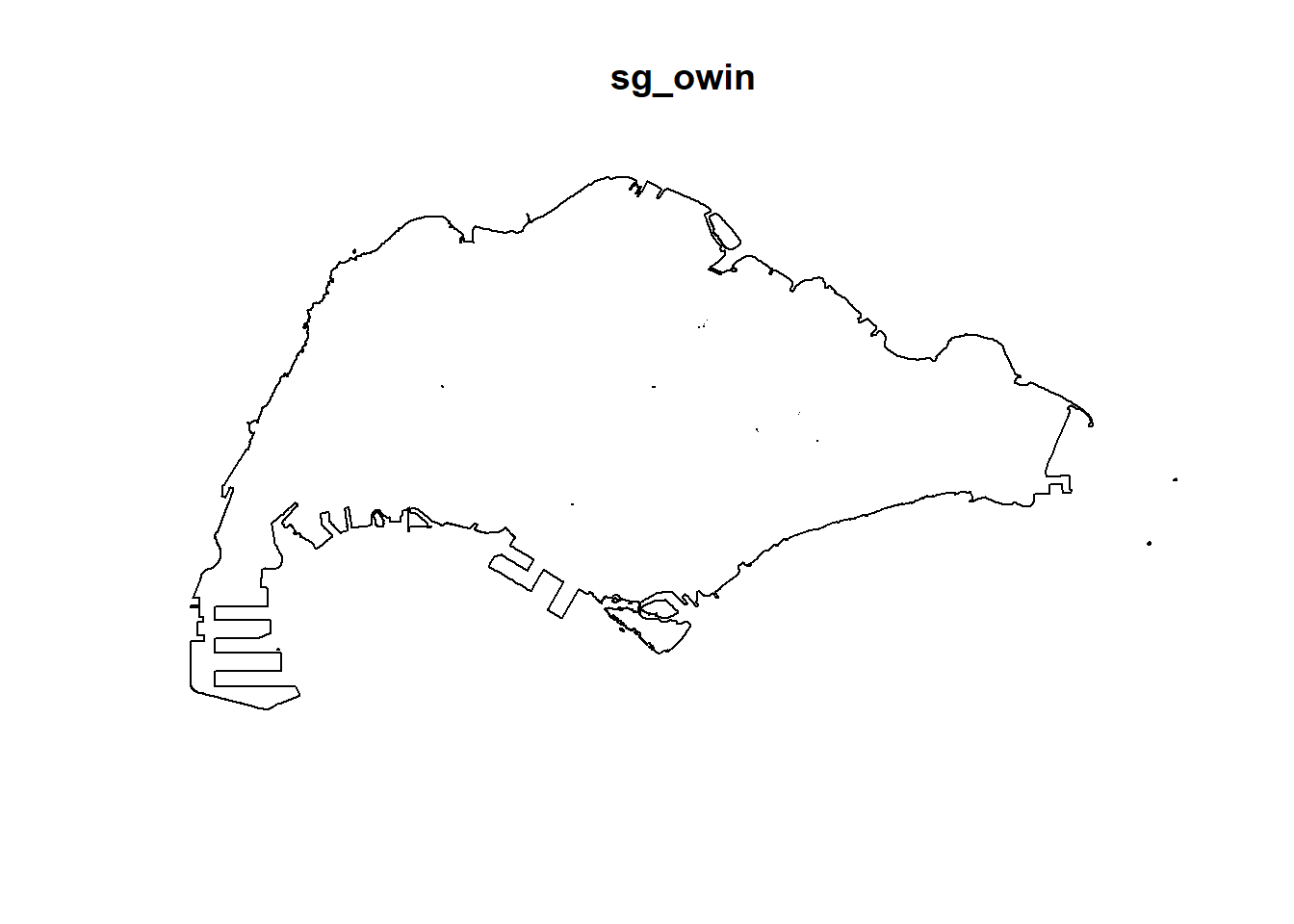 When analysing spatial point patterns, it is a good practice to confine the analysis with a geographical area like Singapore boundary. In spatstat, an object called owin is specially designed to represent this polygonal region.