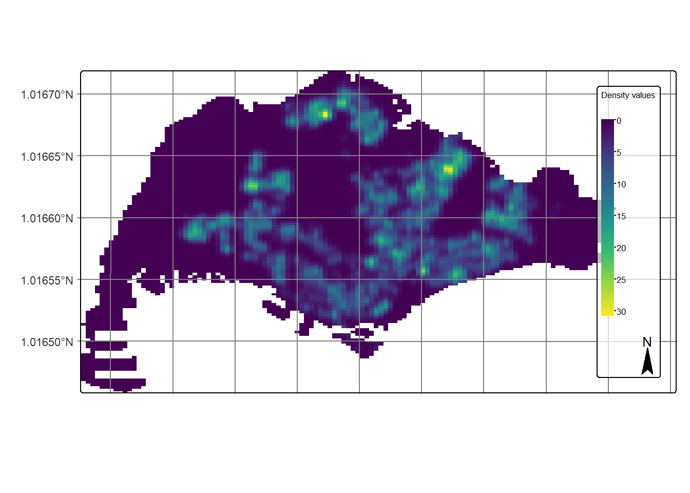 - terra: The terra package is a modern spatial data analysis package designed to replace the raster package. It offers improved speed and efficiency when working with both raster and vector spatial data, particularly with large datasets. terra provides functionalities for creating, reading, manipulating, and writing raster and vector data, and it’s built on top of GDAL and PROJ libraries for enhanced performance. In this hands-on exercise, it will be used to convert image output generate by spatstat into terra format.