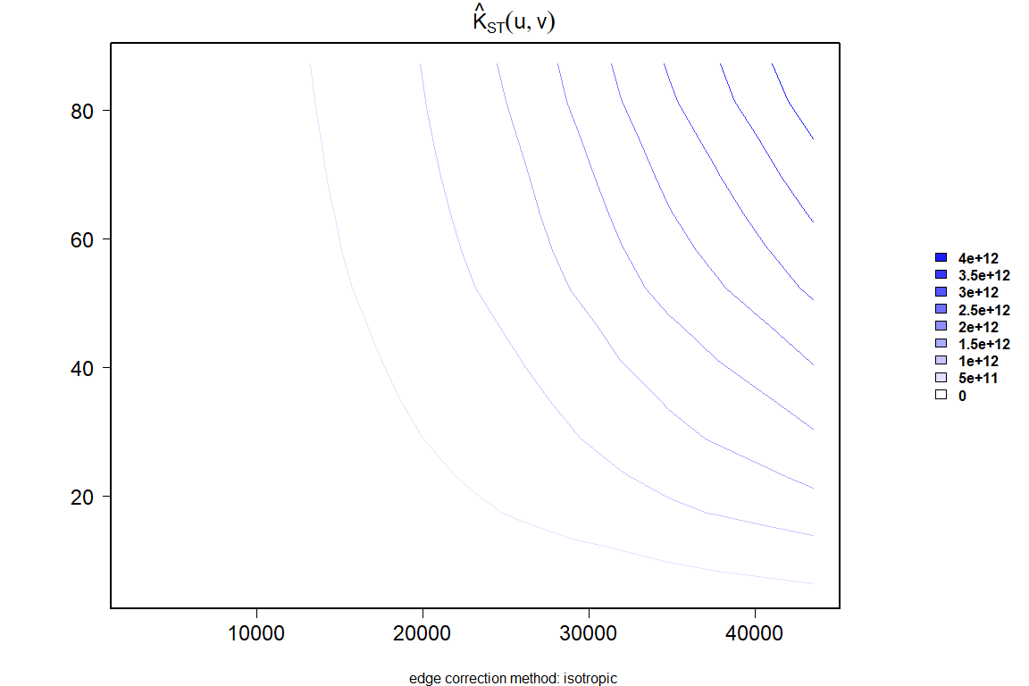 - If the contours show high values for small values of uu and vv, it suggests clustering at short spatial and temporal distances, meaning events occur close to each other in both space and time.