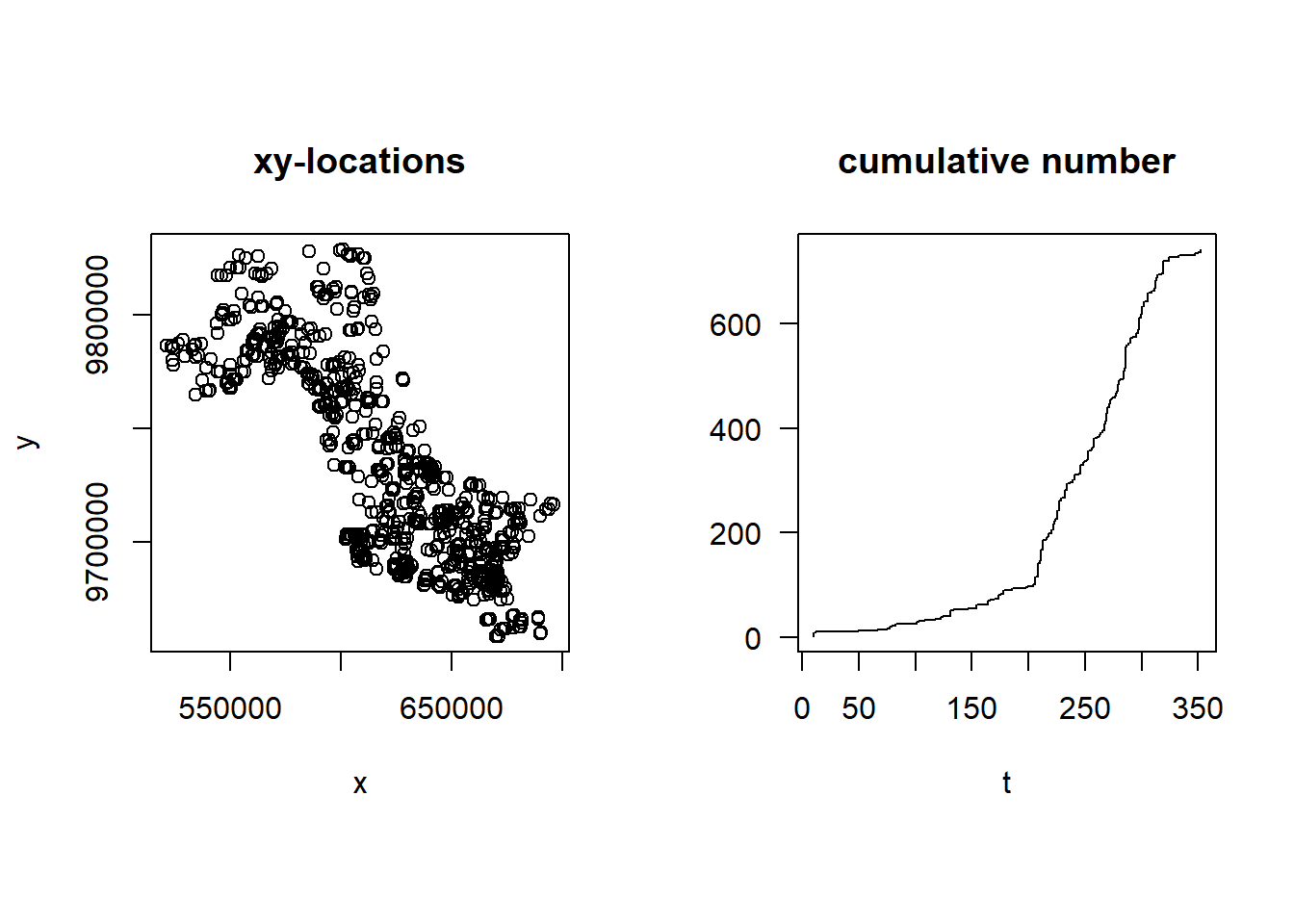 Step 2: Creating a data frame by combining the x- and y-coordinates and temporal event. Note that the temporal event must be in integer.