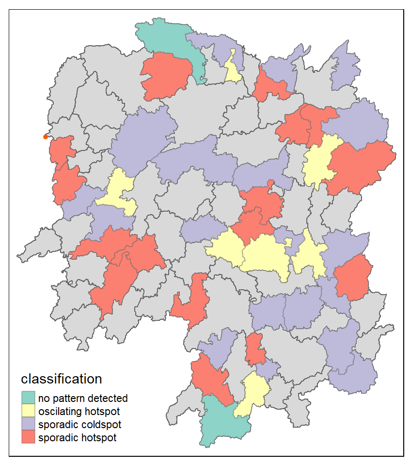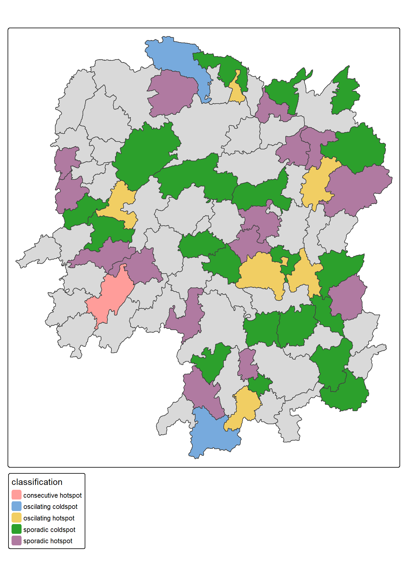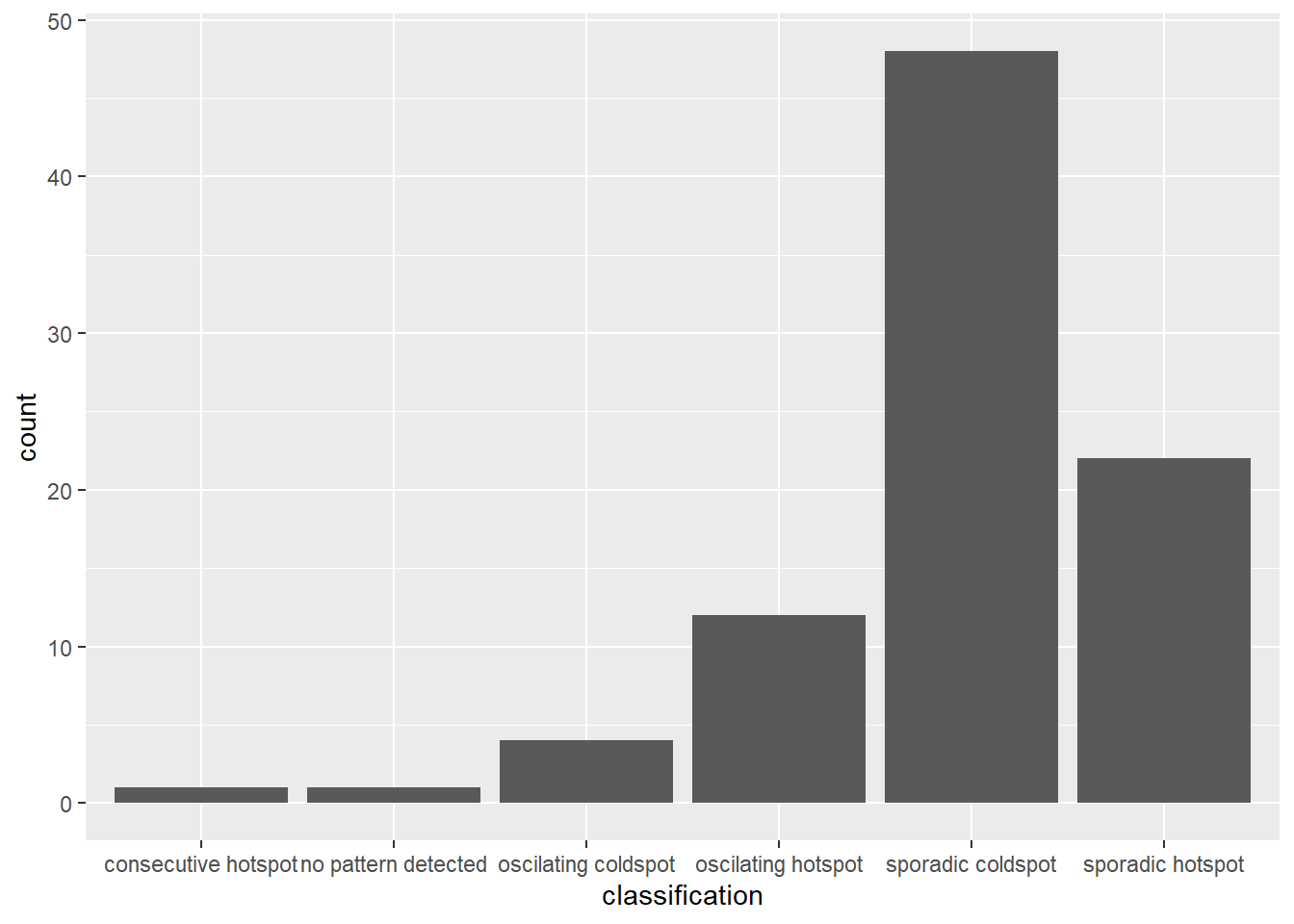 Lastly, we will perform EHSA analysis by using emerging_hotspot_analysis()
