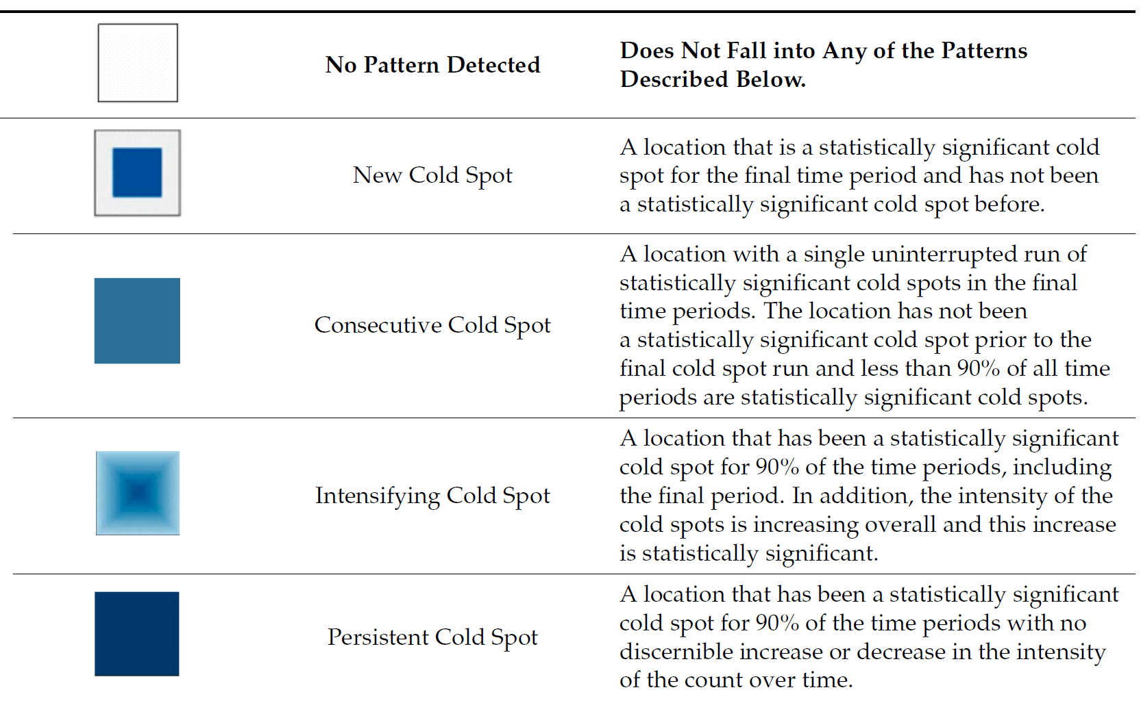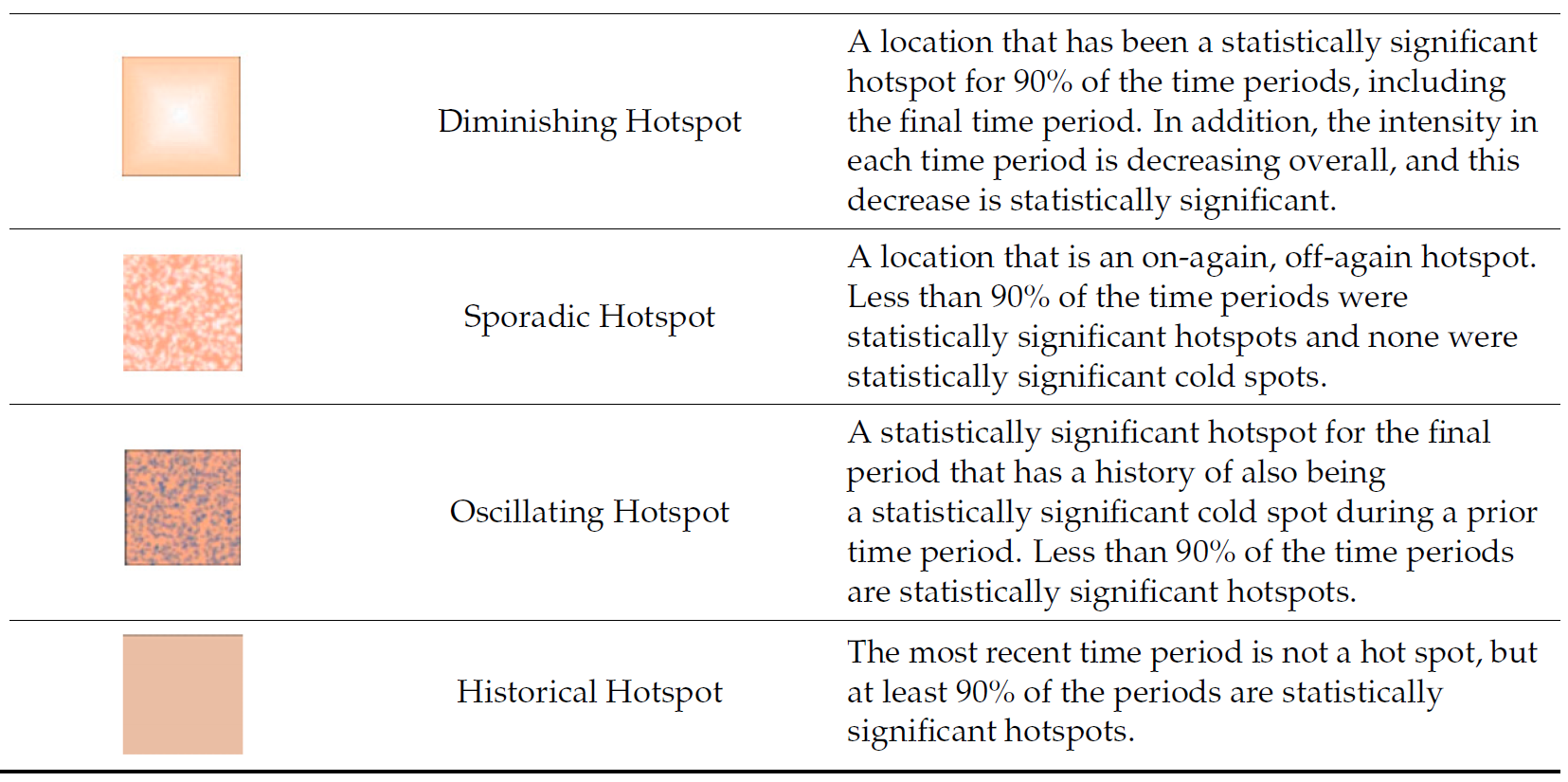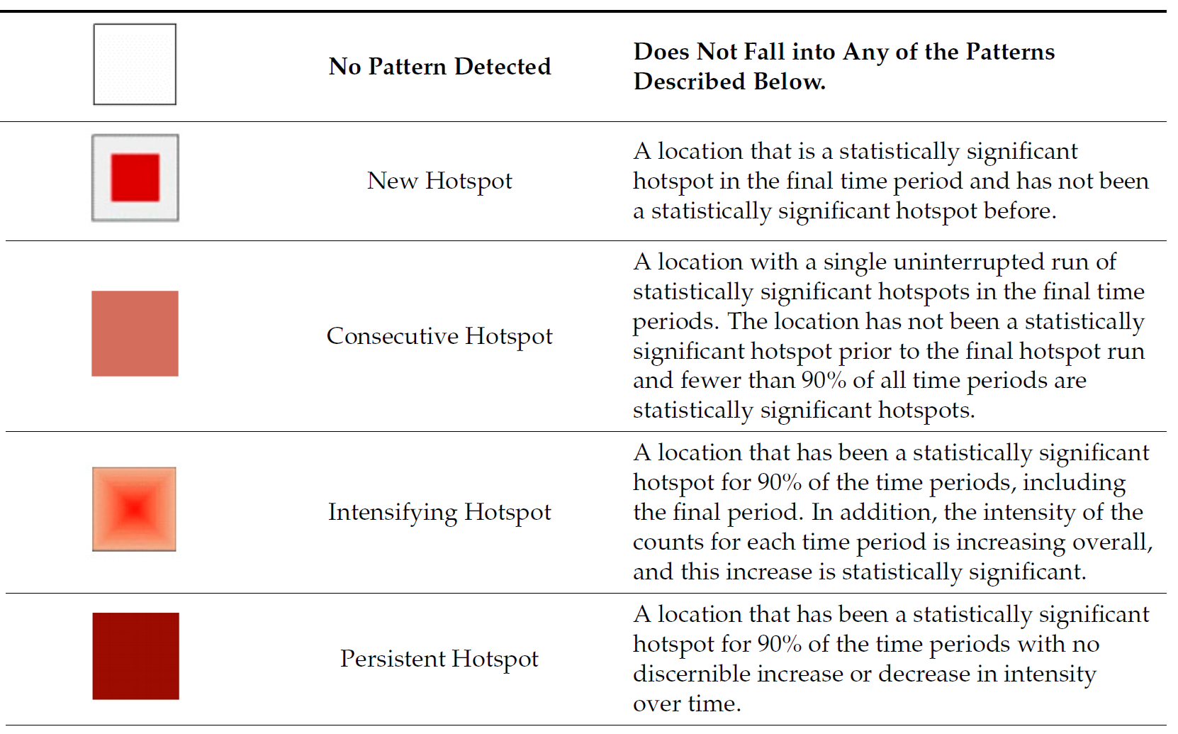 Emerging Hot Spots Analysis (EHSA) is a spatio-temporal statistical technique that identifies and categorizes areas where clusters of high or low values of a phenomenon are developing, intensifying, or diminishing over time. It combines the Getis-Ord Gi* statistic, which measures spatial clustering, with the Mann-Kendall trend test, a non-parametric trend analysis, to detect trends in these clusters within a “space-time cube” of data. This process allows for the detection of patterns such as new hot spots, persistent trends, or diminishing cold spots across different confidence levels.