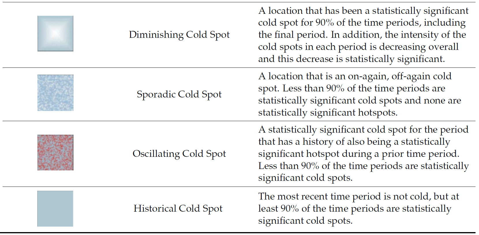 - Categorising each study area location by referring to the resultant trend z-score and p-value for each location with data, and with the hot spot z-score and p-value for each bin.