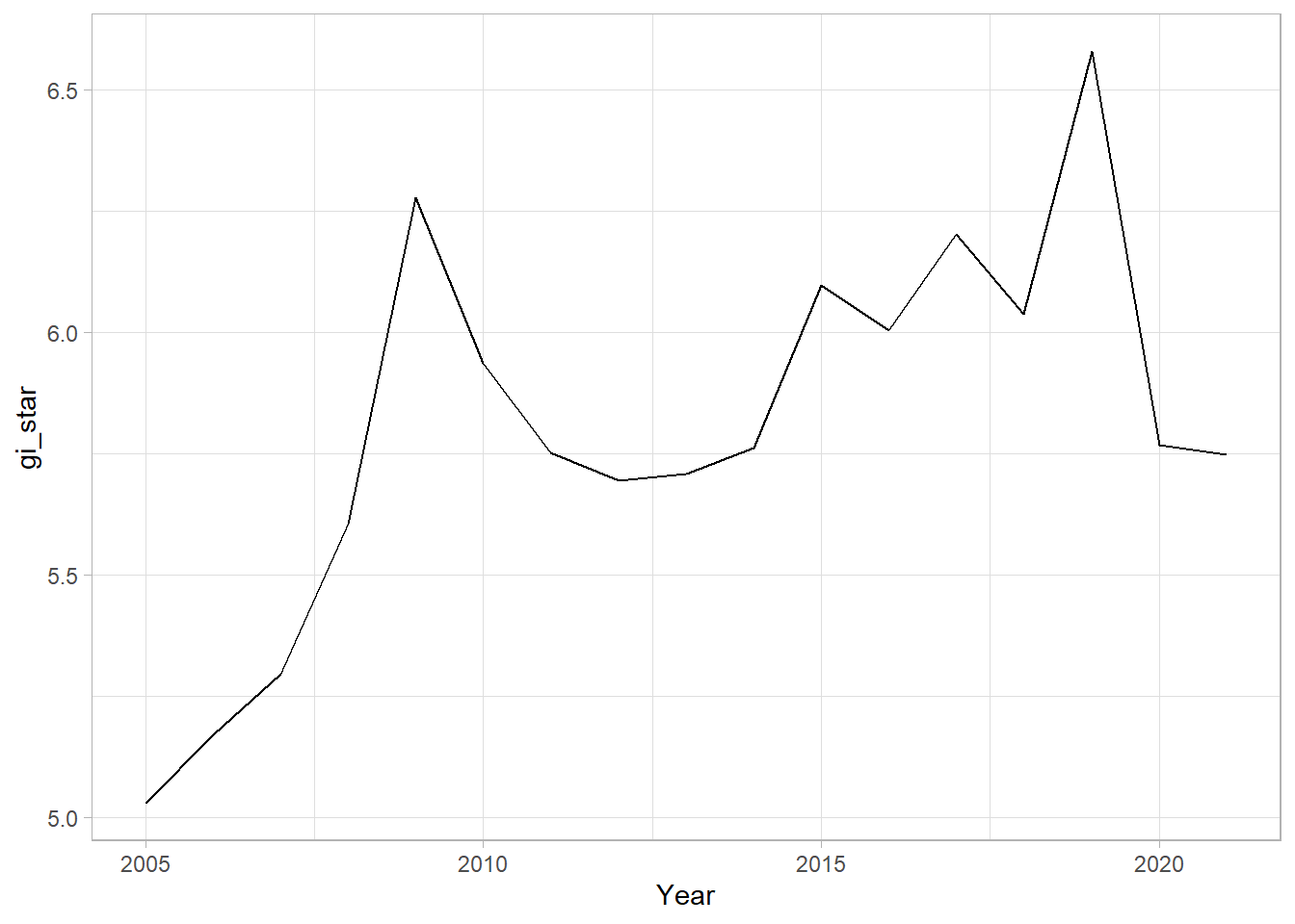 We can use these new columns to manually calculate the local Gi* for each location. We can do this by grouping by Year and using local_gstar_perm()