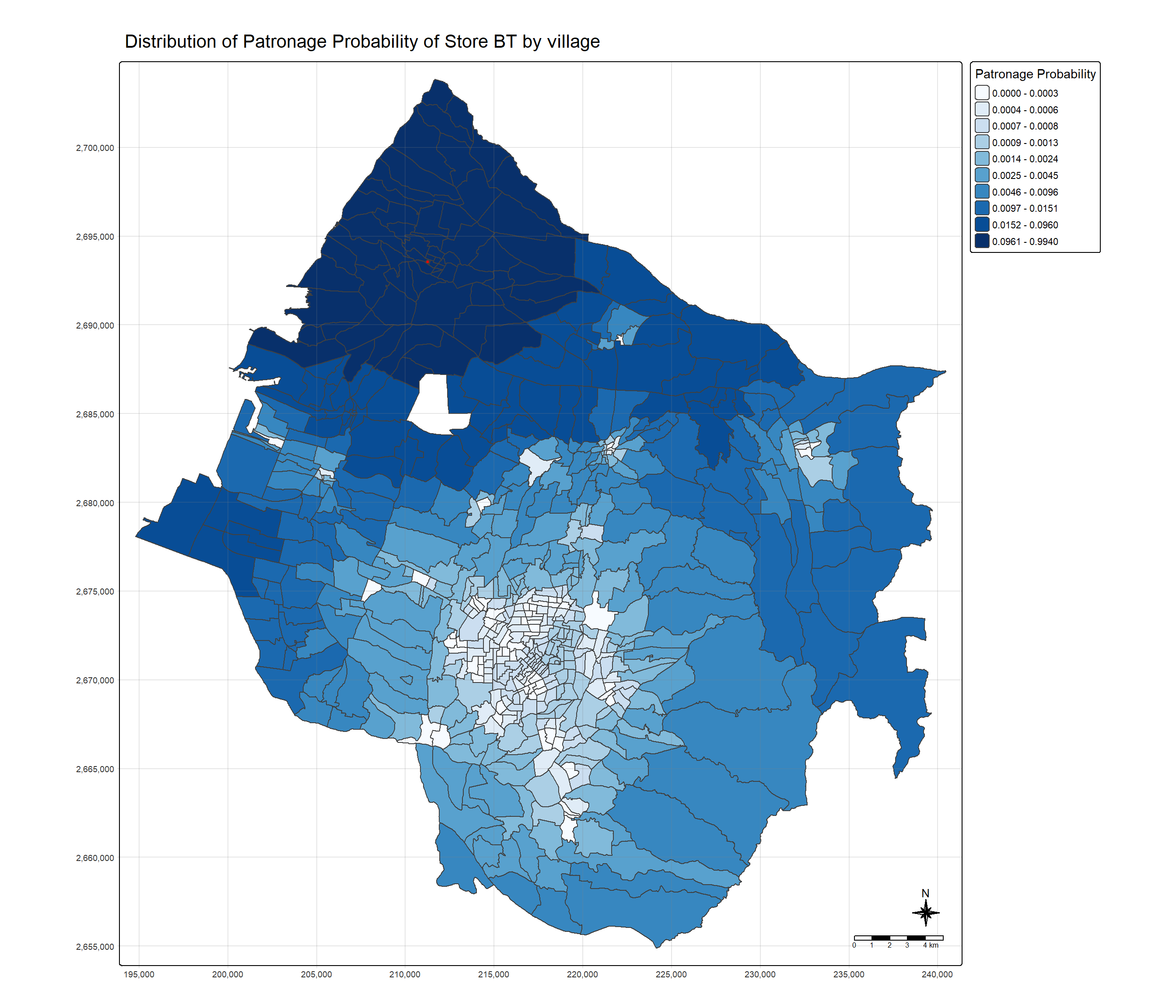 tm_title("Distribution of Patronage Probability of Store BT by village") +